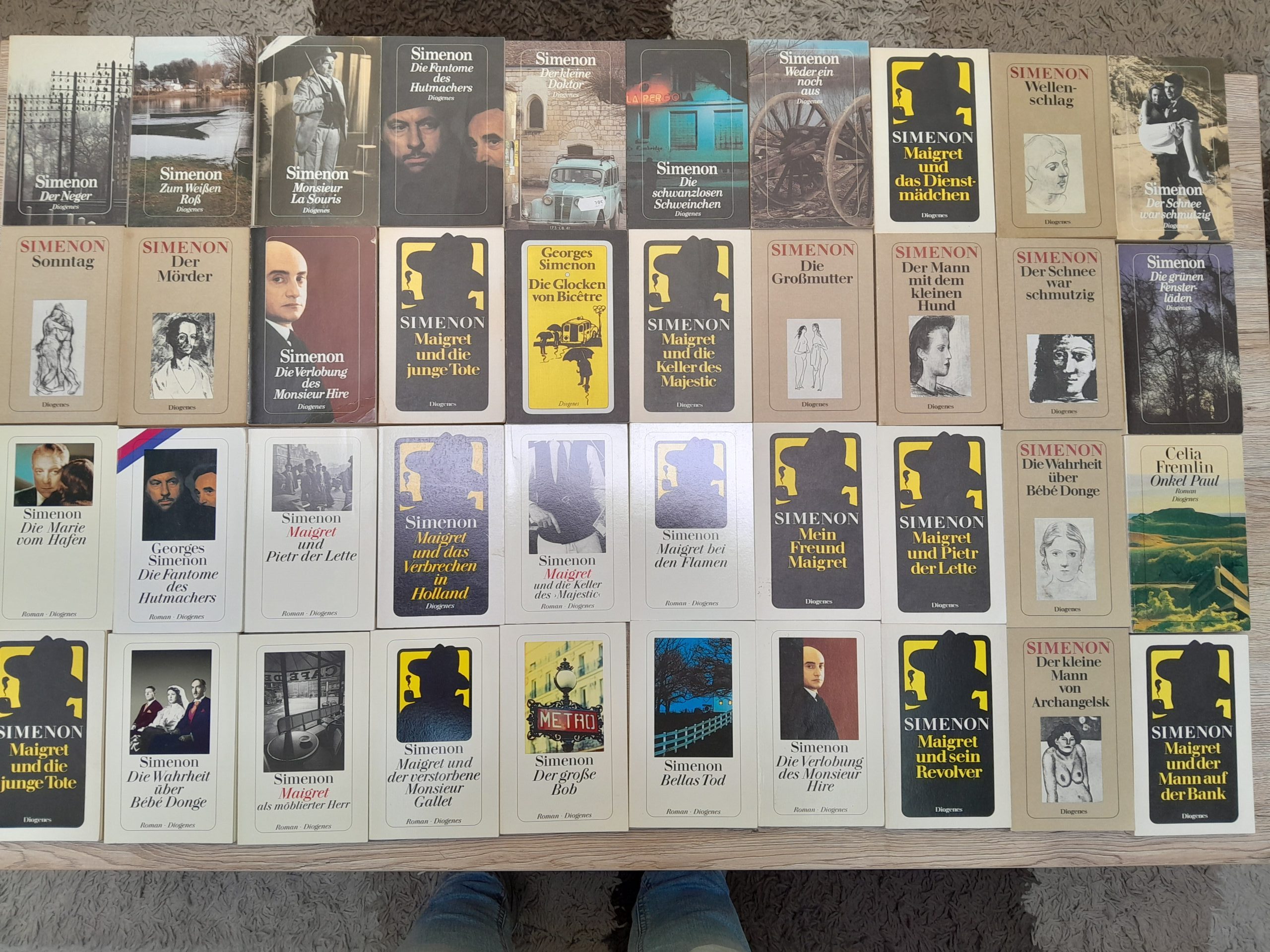 40 Simenon-Romane aus dem Diogenes Verlag in einer Bücherkiste.