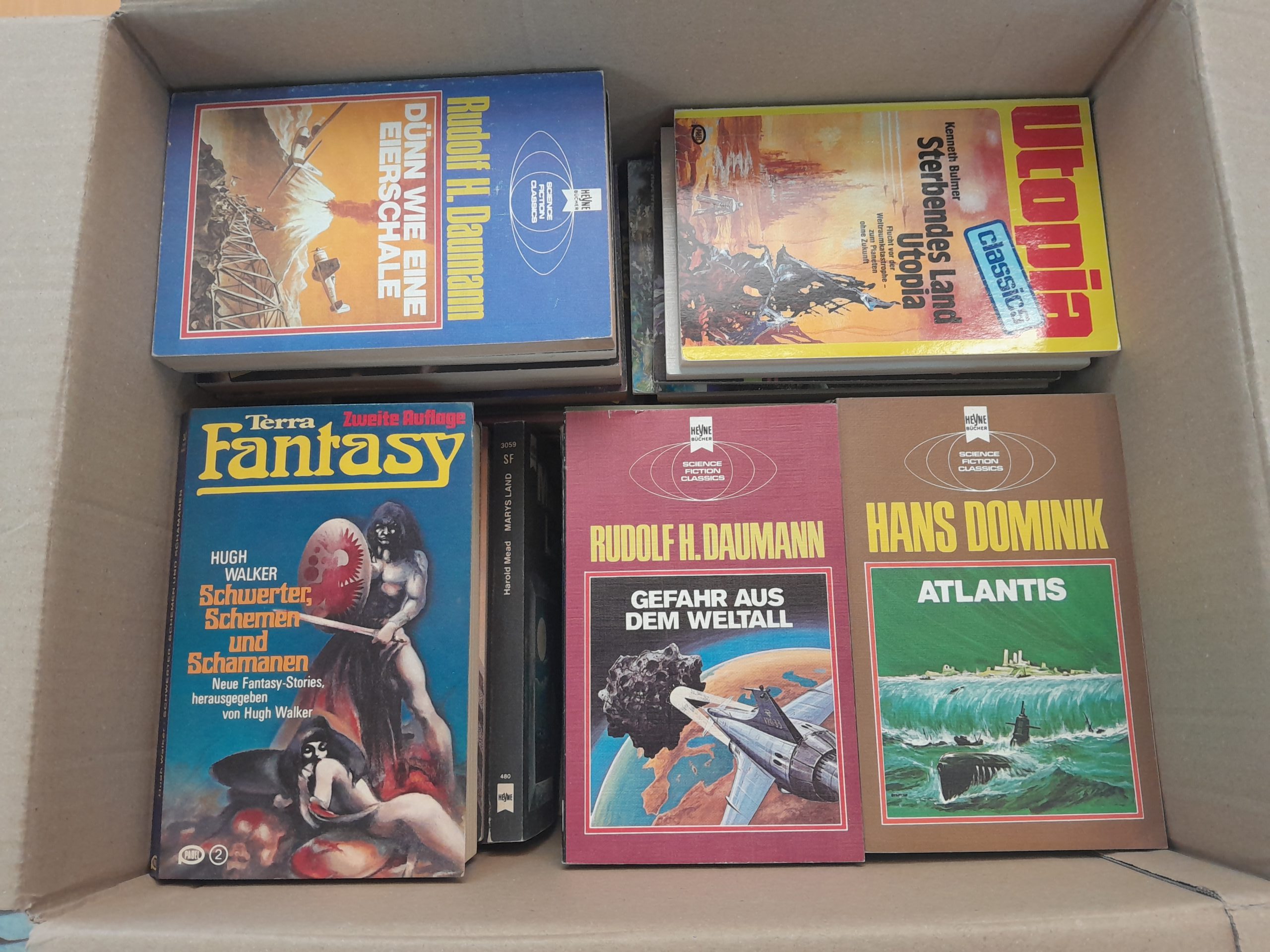 Science Fiction Bücherkiste mit 70 Taschenbüchern aus den Verlagen Bastei Lübbe, Heyne, Pabel, Ullstein und vielen mehr.
