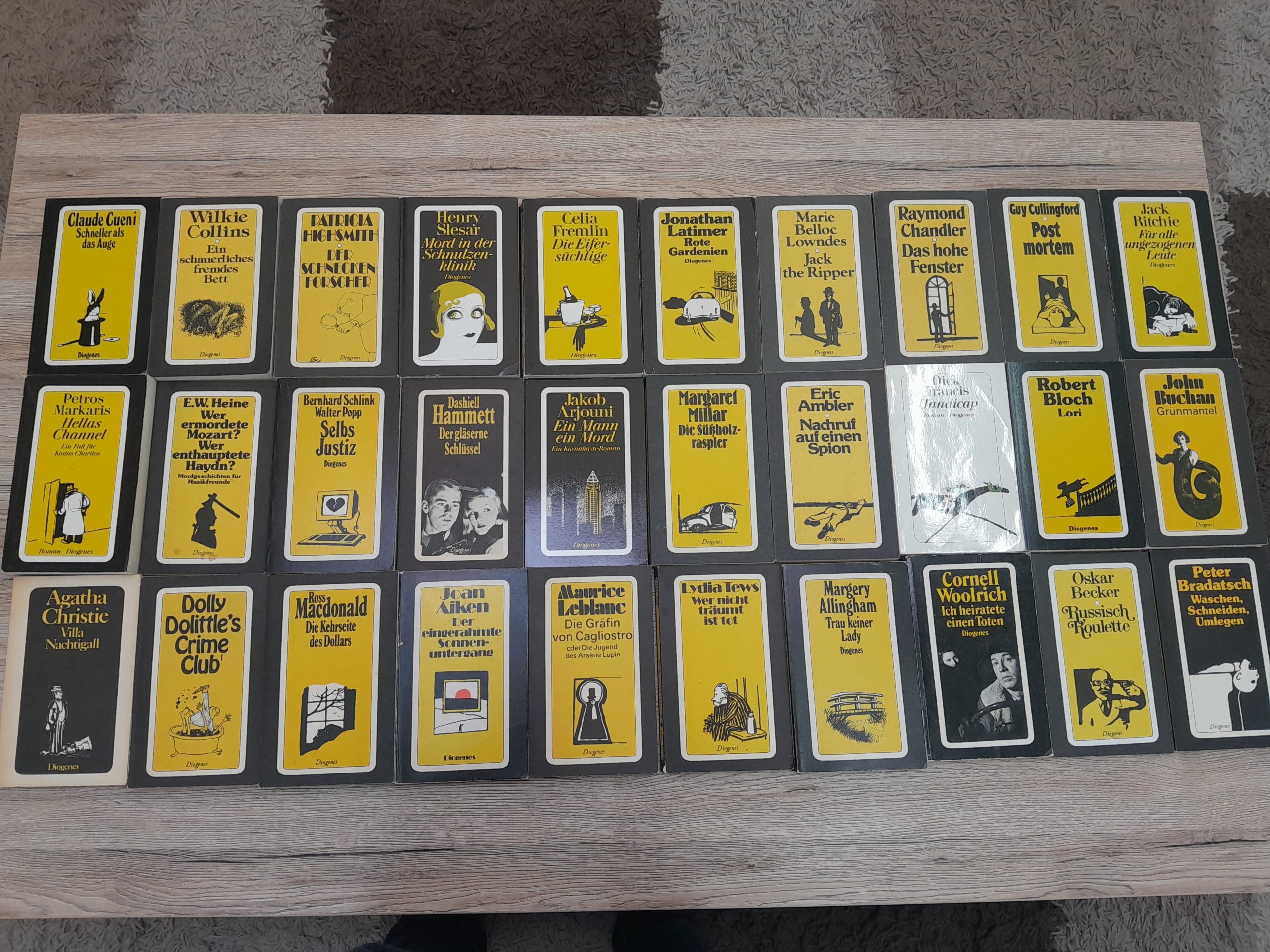 30 Krimis aus dem Diogenes Verlag, mit Büchern von Eric Ambler, Ross Macdonald, Patricia Highsmith, Raymond Chandler u.v.a.